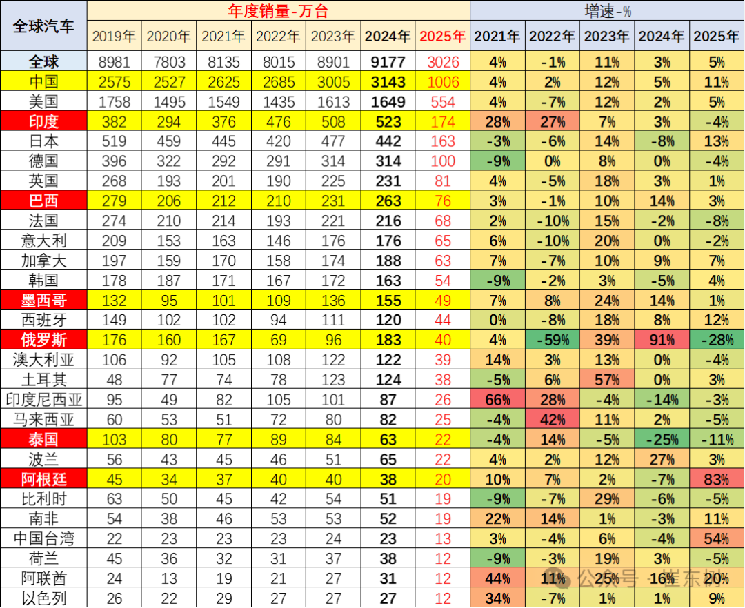 2025年1-4月世界车市较平稳,因中国春节在1月,春节前车市销量低导致世界1月增长较低, 2-4月世界车市走势较强,中国车企贡献2-4月较大增量。