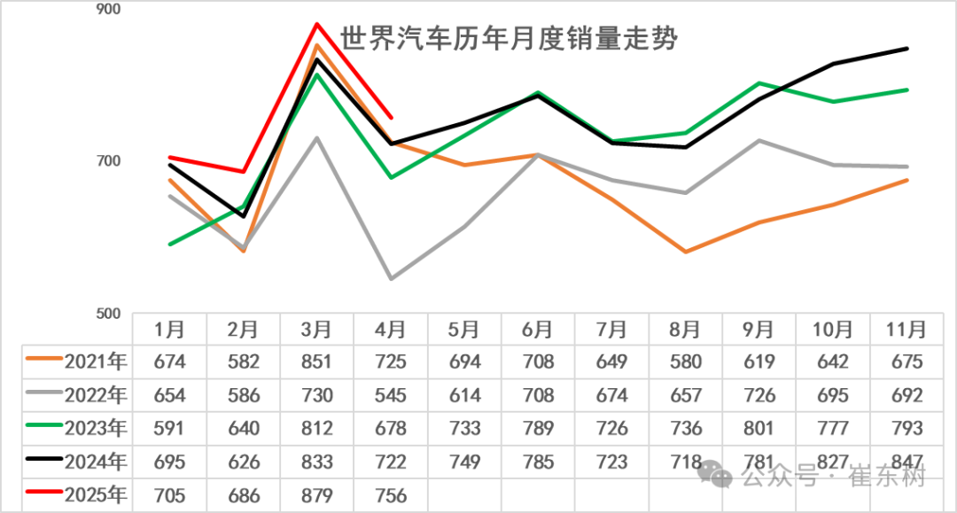 虽然世界汽车环境复杂,但2025年1-4月销量3026万台,超越2019年,恢复到中高位水平,但仍低于2017年和2018年。