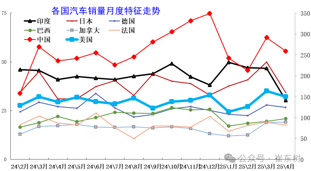 2025年世界市场进一步分化,中国份额逐步回升。2025年初,随着两新补贴政策逐步启动,导致中国汽车销量回升,1月份额达到34%;但由于美国、日本等市场的暂时偏高,4月回升到34%的较好水平。