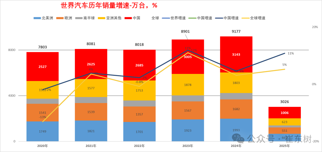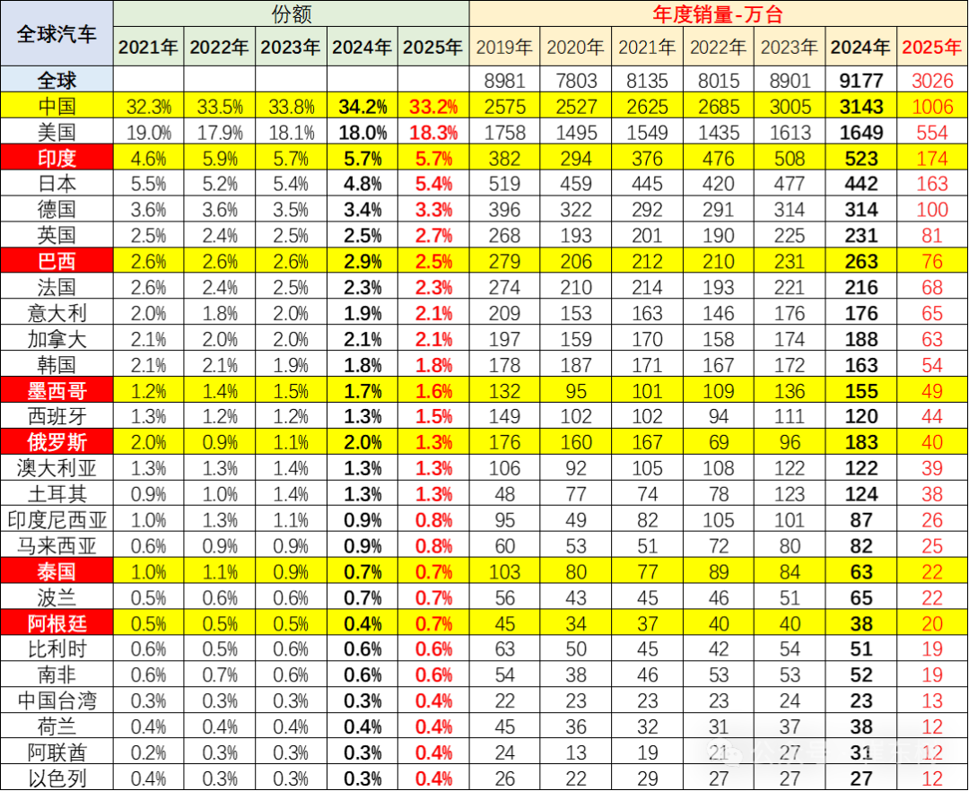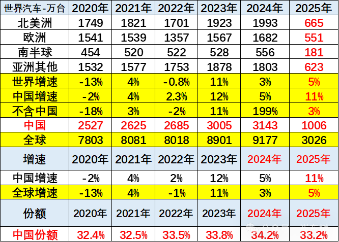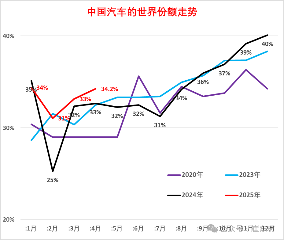 2020年以来中国的世界份额持续提升,到2023年达到33.8%,2024年中国车市达到34.2%,2025年年初中国车市达到世界33.2%,已经是很好的。
