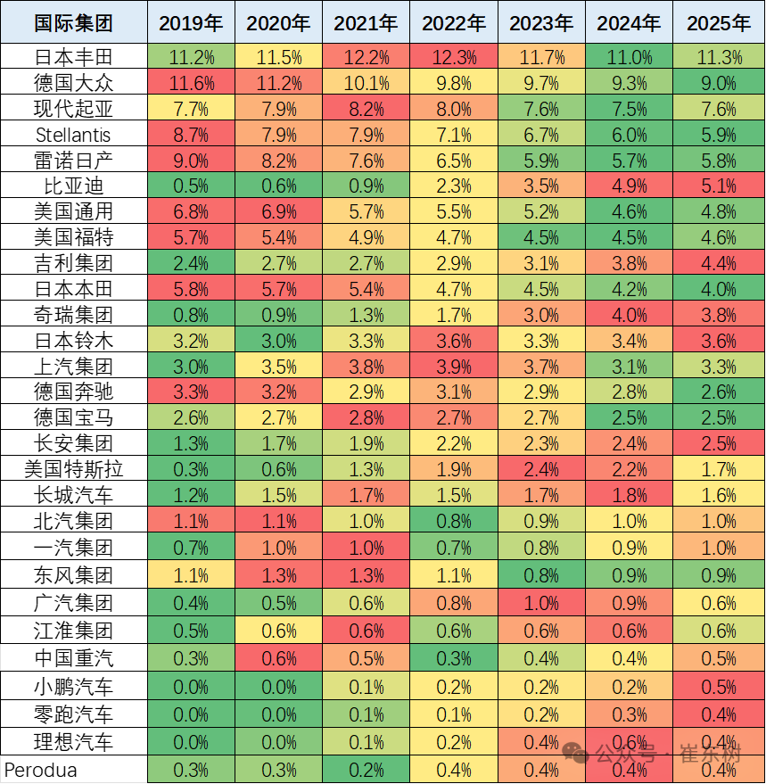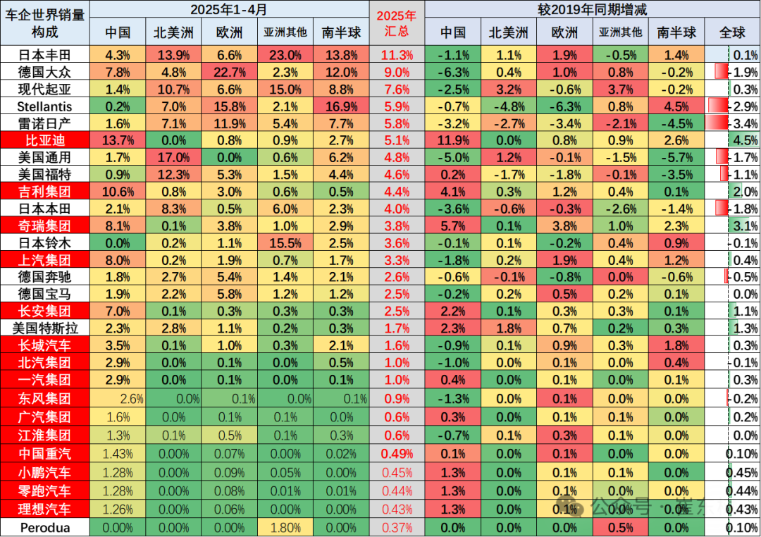 2025年1-4月丰田集团表现相对较强,较2019年上升0.1个百分点,2025年在世界份额保持在11.3%左右的水平,这也是因为丰田在欧洲和北美市场总体表现较强。