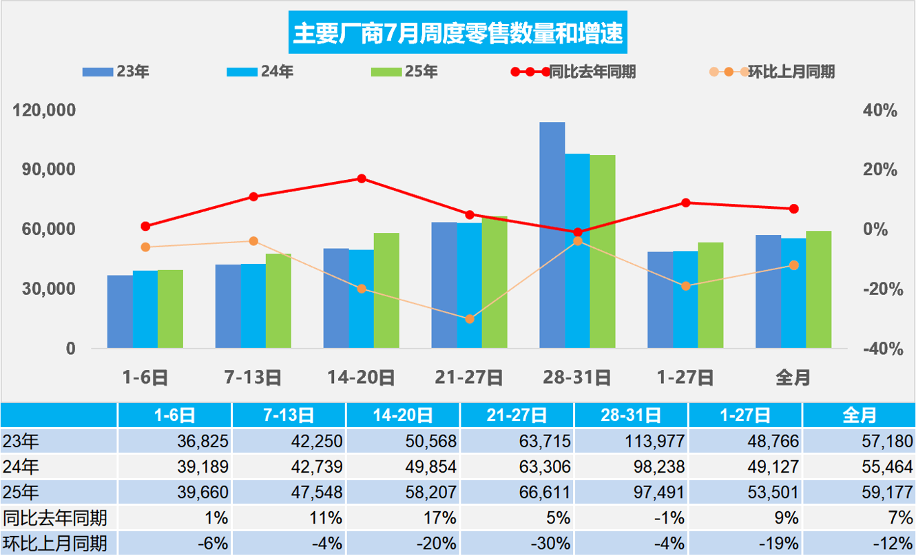 7月第四周全国乘用车市场日均零售6.7万辆,同比去年7月同期增长5%,较上月同期下降30%。