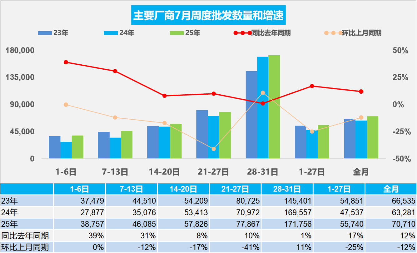 7月第五周全国乘用车厂商日均批发17.2万辆,同比去年7月同期增长1%,较上月同期增长11%。